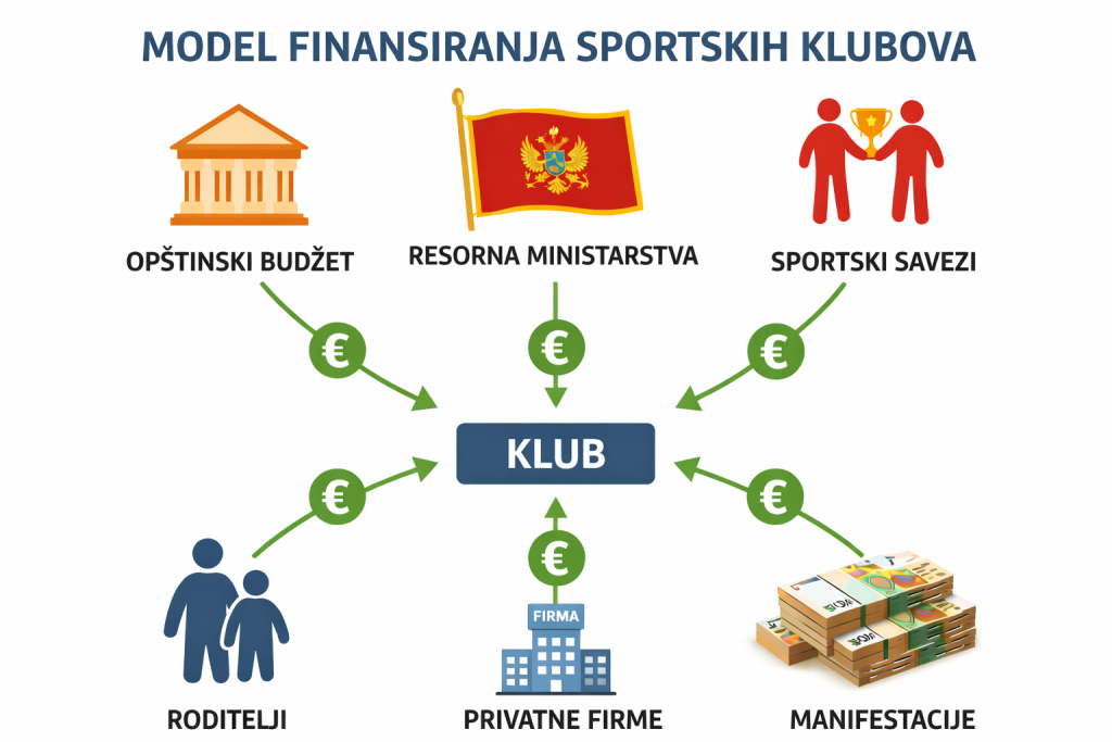 Model finansiranja je višeslojan: dio novca dolazi iz opštinskog budžeta kroz javni konkurs, dodatna sredstva obezbjeđuju se kroz konkurse Vlade Crne Gore i resornih ministarstava, finansijsku podršku daju sportski savezi, privatne firme se pojavljuju kao sponzori, dok roditelji plaćaju članarine i troškove putovanja svoje djece. Uz sve to, klubovi naknadno apliciraju i za dodatno sufinansiranje organizacije sportskih manifestacija.
