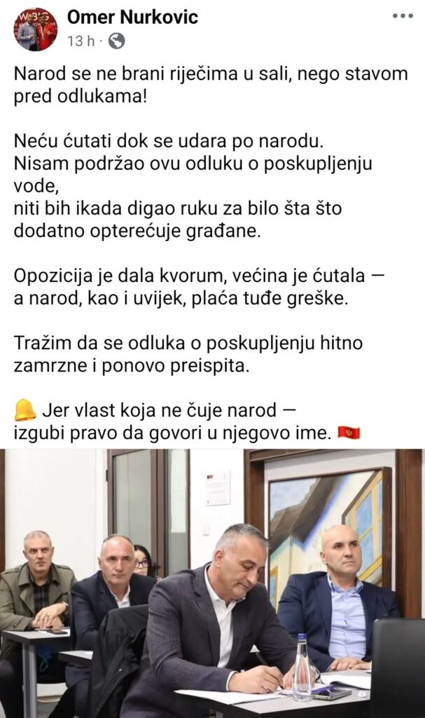 Nisam podržao ovu odluku o poskupljenju vode, niti bih ikada digao ruku za bilo šta što dodatno opterećuje građane.